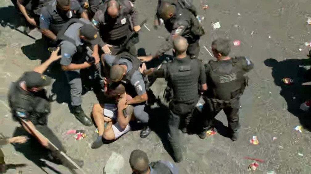 Houve um registro no momento em que agentes reagiram com violência para imobilizar um folião, que resistiu à detenção. Após ser agredido e derrubado no chão, o homem foi algemado e levado para a viatura da PM, com o rosto sangrando.