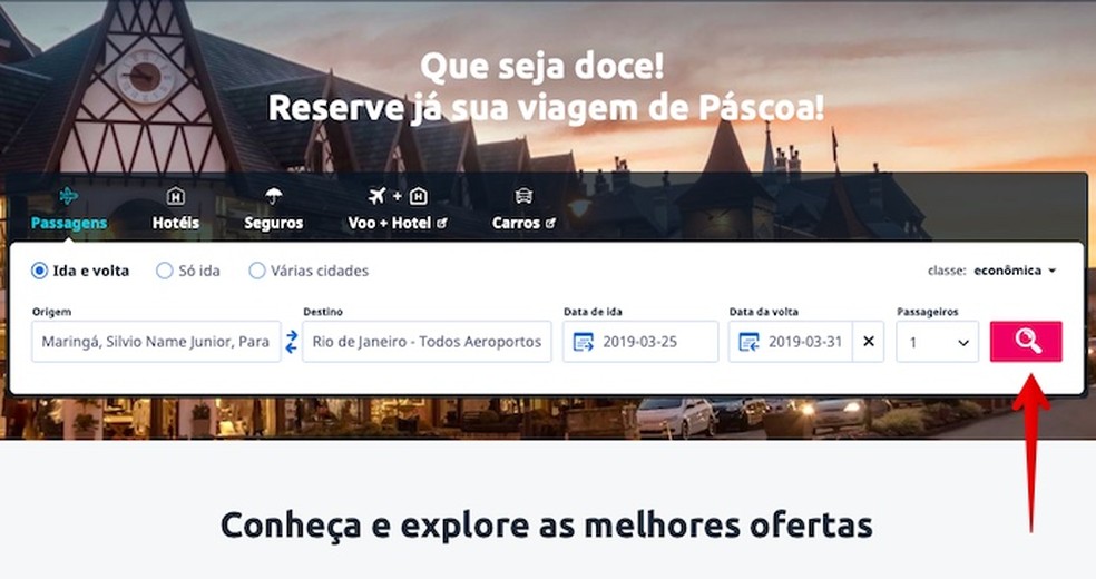Passo 1. Acesse o site do eDestinos e, na página inicial, selecione se você quer passagens de ida e volta ou só de ida. Logo abaixo, defina a cidade de embarque e de destino, bem como a data da sua viagem e número de pessoas e classe. Feito isso, clique sobre o ícone da lupa;