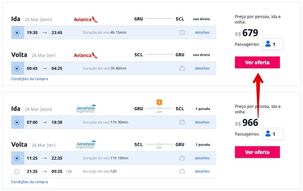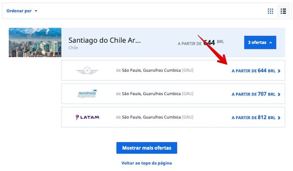 Passo 2. Após selecionar o destino, escolha a companhia aérea de seu interesse e clique sobre o valor das passagens, à direita do nome;