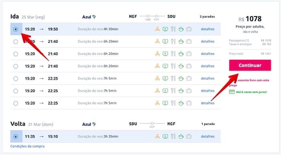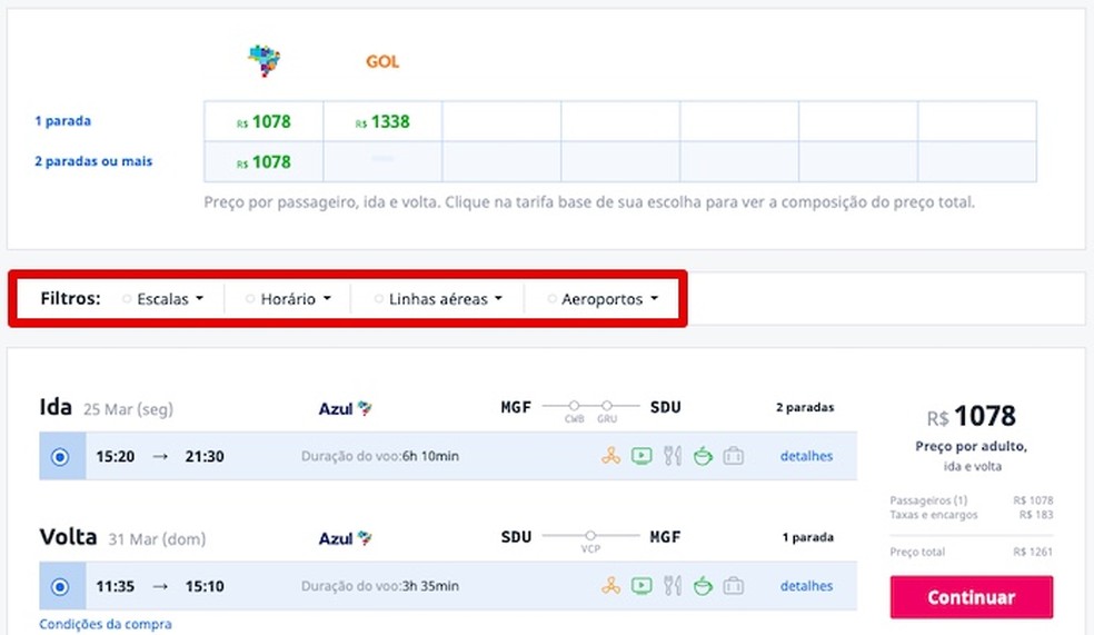 Passo 3. Após escolher os filtros desejados, role a página de resultados e localize o voo que você quer comprar. Selecione o horário de embarque na caixa de seleção à esquerda e, por fim, clique em "Continuar" para acessar as opções de pagamento.