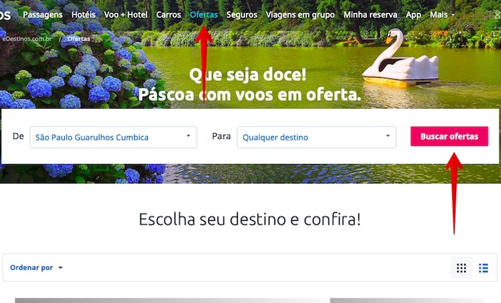 Passo 1. Na página inicial do site eDestinos, clique em "Ofertas". Em seguida, caso queira, selecione as cidades de embarque e destino. Feito isso, clique em "Buscar ofertas";